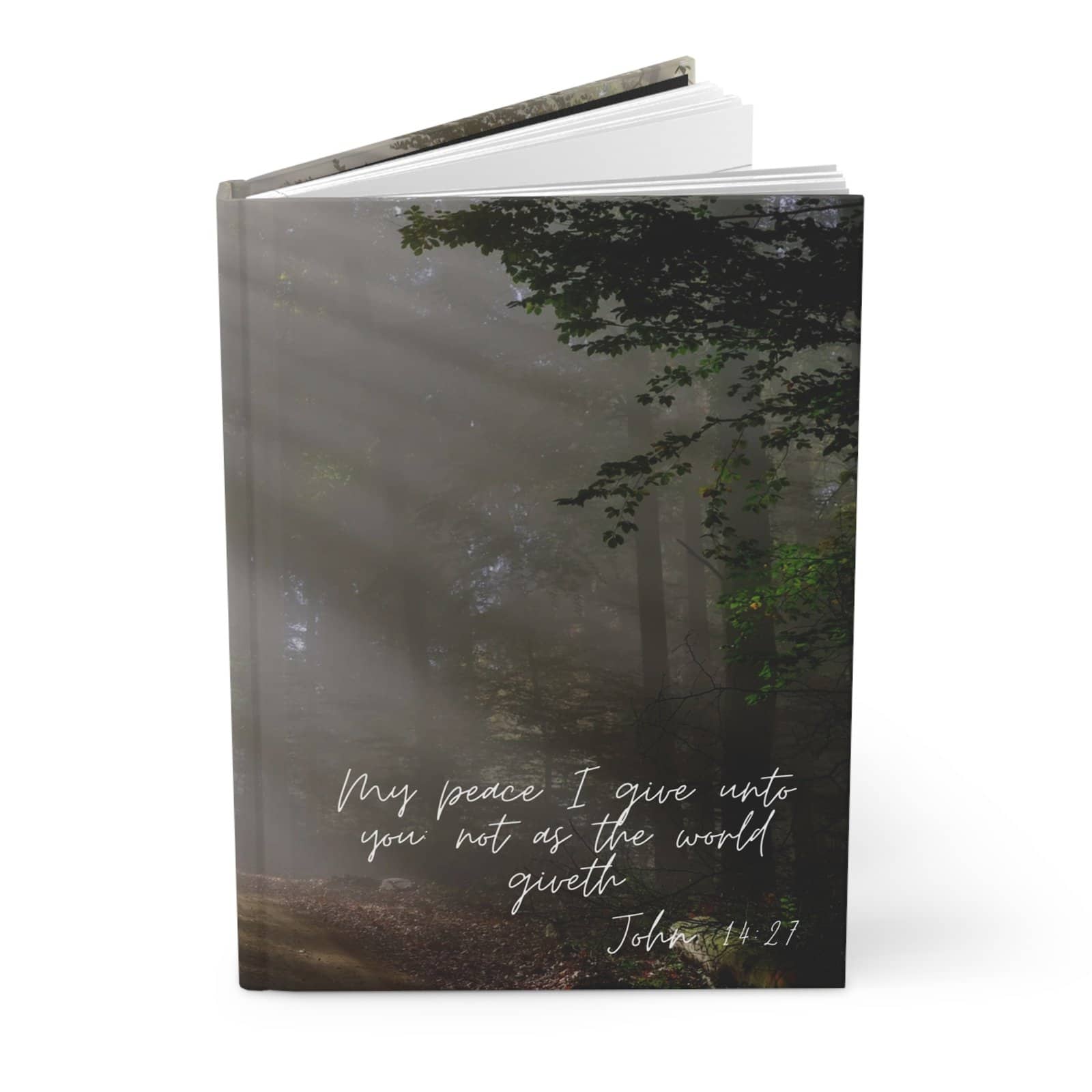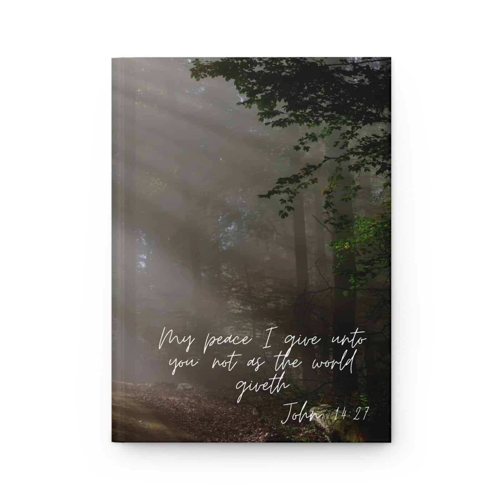 This Christian journal features the calming Bible verse, “My peace I give unto you; not as the world giveth” from John 14:27, set against a serene forest background. Perfect for daily reflections, prayer journaling, or capturing personal thoughts and inspirations. Ideal for anyone seeking encouragement and peace through scripture, this inspirational journal is a beautiful and thoughtful gift for friends and family.