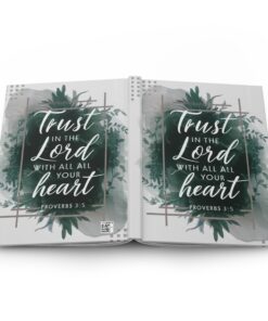 This hardcover journal is a quiet companion for moments when faith needs to be named. The dark green watercolor cover, brushed with leafy accents and the handwritten verse “Trust in the Lord with all your heart – Proverbs 3:5,” invites pause. Lay it on a kitchen table, slip it into a tote before church, or keep it by your nightstand for prayers and reflections. Pages flex gently with the sewn spine, so your thoughts rest comfortably whether you’re jotting sermon notes, tracing gratitude lists, or working through hard questions. The matte cover keeps the look understated and reverent — a little sanctuary you can carry, open whenever you need a steadying verse.